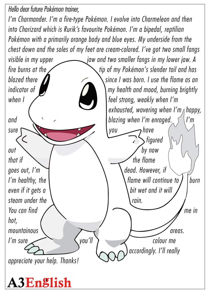 October 16, 2019October 16, 2019rurikrossimanuzzatoLeave a Comment on Pokémon 118 Pokémon 118 Colouring Exercise Charmander Share this: Share on X (Opens in new window) X Share on Facebook (Opens in new window) Facebook Like Loading...